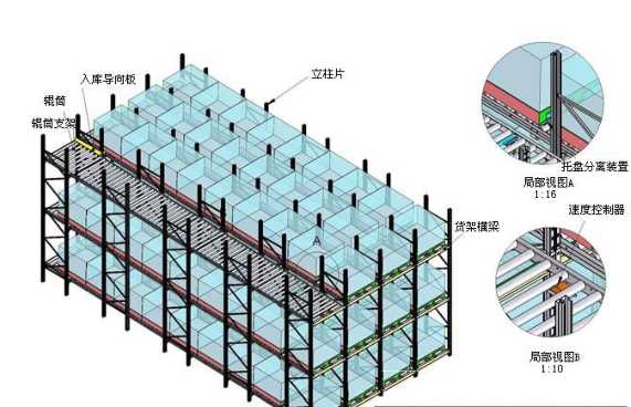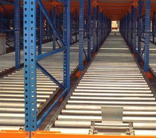 重力式貨架的特點(diǎn)是, 每一個(gè)貨格就是一個(gè)具有一定坡度的滑道, 每個(gè)滑道可放若干個(gè)貨物單元,貨架滑道高的一端為入庫端,低的一端為出庫端。入庫時(shí),堆垛機(jī)或叉車將貨物單元送進(jìn)入庫端,貨物單元在重力的作用下,從入庫端向出庫端滑動(dòng),一直滑到出庫端或已有貨物單元的后面;當(dāng)需要出庫時(shí),有堆垛機(jī)或叉車取走位于出庫端的第一個(gè)貨物單元,其后面貨物單元下滑到出庫端的第一個(gè)貨位。注意點(diǎn)貨架總深度(即導(dǎo)軌長度)不宜過大,否則不可利用的上下“死角”會(huì)較大,影響空間利用,且坡道過長,下滑的可控性會(huì)較差,下滑的沖力較大,易引起下滑不暢、阻住,托盤貨物的傾翻。