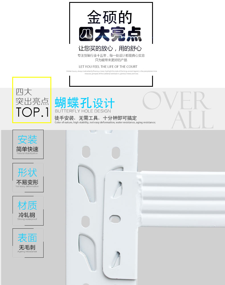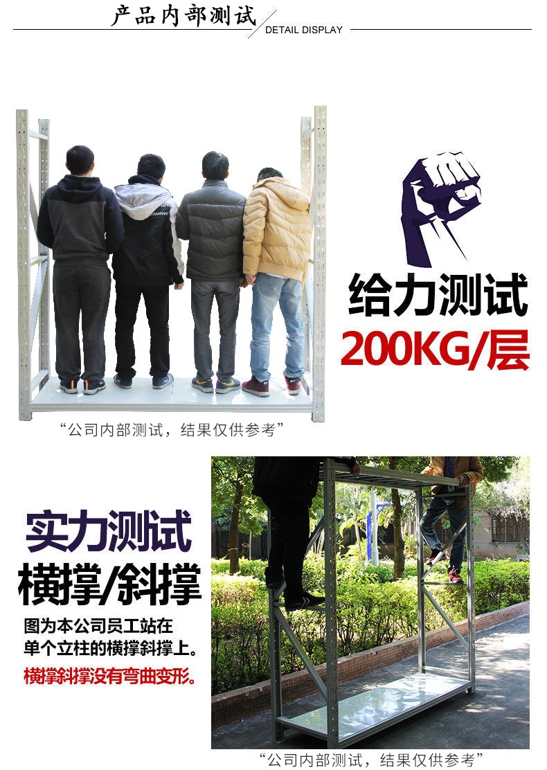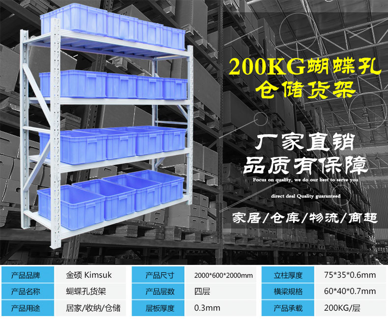 ![]() < > | 200KG 蝴蝶孔中型貨架型號(hào):200KG 蝴蝶孔中型貨架 規(guī)格:長200cmx寬60cmx高200cm 貨架層數(shù):4層(可增加層數(shù)) 貨架承重:200KG/層 立柱厚度:75*35*0.68mm C型鋼 橫梁規(guī)格:60*40*0.55mm P型鋼 層板厚度:0.3mm冷軋鋼板 訂購熱線:189-2509-6199 |