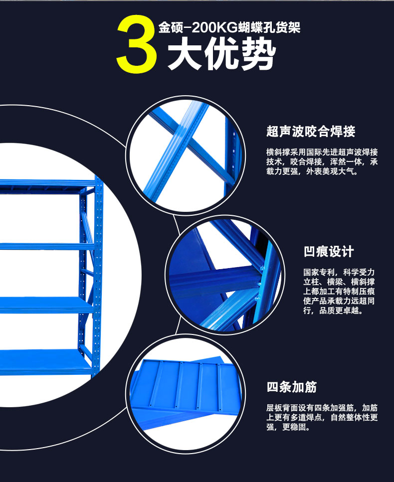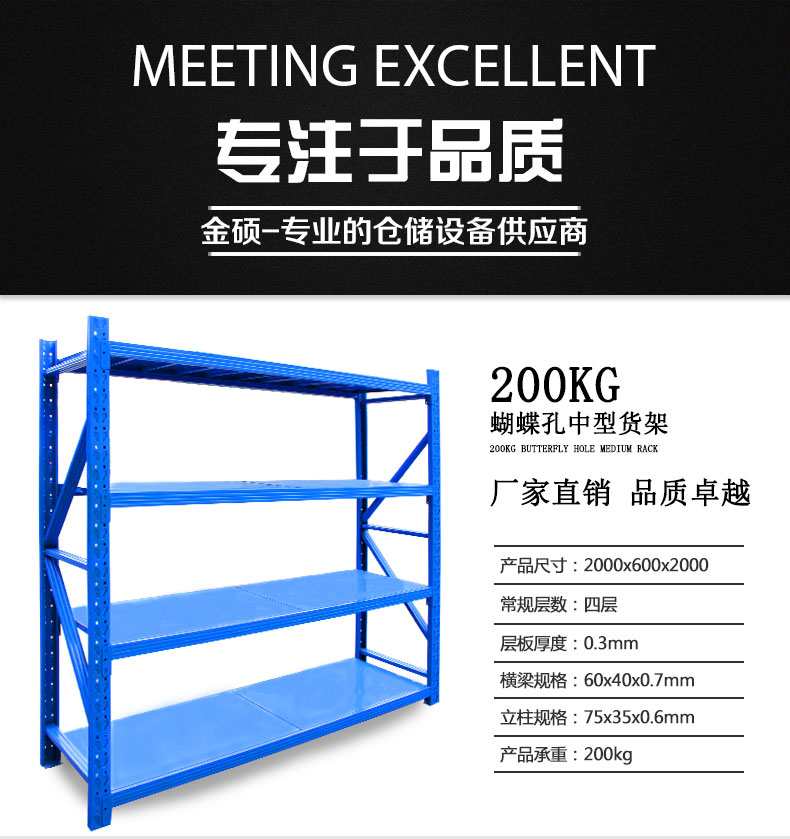 ![]() < > | 200KG 蝴蝶孔中型貨架型號(hào):200KG 蝴蝶孔中型貨架 規(guī)格:長200cmx寬60cmx高200cm 貨架層數(shù):4層(可增加層數(shù)) 貨架承重:200KG/層 立柱厚度:75*35*0.68mm C型鋼 橫梁規(guī)格:60*40*0.55mm P型鋼 層板厚度:0.3mm冷軋鋼板 訂購熱線:189-2509-6199 |