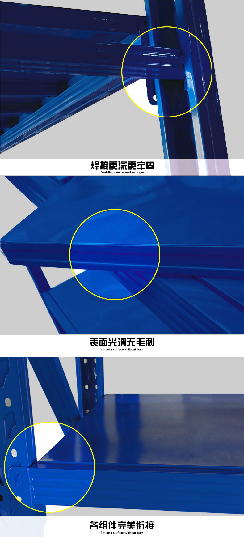 中型貨架標準型外形美觀,適用面廣、安裝拆卸方便、75mm節(jié)距調節(jié)、承載在100 KG~350 KG; 非標型大跨度大承載,75mm節(jié)距調節(jié)外觀新穎,承載在300 KG ~ 1000 KG。中型貨架堅固結實,承載力大,中型貨架廣泛應用于商場、超市、企業(yè)倉庫及事業(yè)單位。通常分為中量A型貨架、中量B型貨架和中量C型貨架。一般都可以拆裝組合,層板高度可以調節(jié);承重量層承重200-800公斤;貨架所有金屬件全部經過防銹處理,外表經靜電噴涂;中型貨架適用于大中小型倉庫存放貨物。在實際應用中分中A型貨架和中B型貨架。