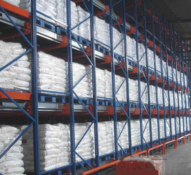 化工貨架采用托盤存取模式,適用于品種少,批量大類型的貨物儲(chǔ)存?;へ浖艹丝拷ǖ赖呢浳唬捎诓孳囆枰M(jìn)入貨架內(nèi)部存取貨物,通常單面取貨建議不超過(guò)7個(gè)貨位深度。為提高叉車運(yùn)行速度,可根據(jù)實(shí)際需要選擇配置導(dǎo)向軌道,與貨位式貨架相比,化工貨架的庫(kù)空間利用率可提高30%以上。